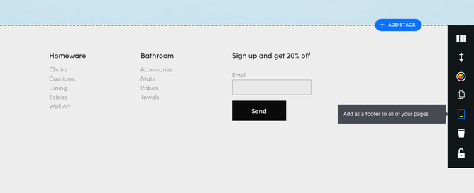 The footer is one thing most sites want to keep the same on every page. That’s why we’ve created a dedicated footer stack, a kind of linked stack applied to the bottom of the page. You can choose to have the footer automatically added to every page of your site—even on your online store or blog pages. As with all other linked stacks, you only need to edit it once and it’s applied across the whole site.