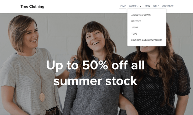 Give your customers a fast and easy way to get to where they want to go. Take this common scenario for example. A customer is browsing a number of online stores simultaneously for a winter jacket. As an ecommerce business, for the best chance to convert and make a sale you want your viewers to have an engaging and simple browsing experience on your website. In addition to your main call-to-actions on your homepage, you could add a dropdown menu subcategory called Jackets & Coats under a main/parent menu.