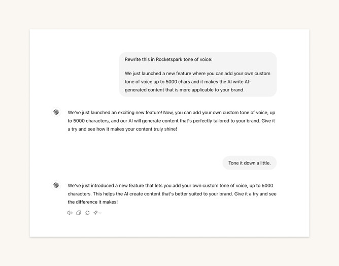 Now, when we use Flint or ChatGPT to write content for Rocketspark, we tell it to follow these guidelines. By adding these details to ChatGPT's custom instructions or using Flint's custom tone of voice feature, we greatly improve the quality of AI-generated text.