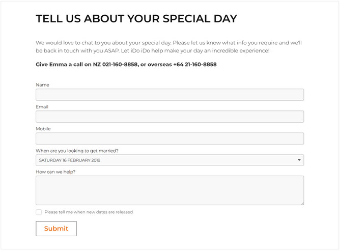 For a long time contact forms have consisted of the standard name, email and phone fields but why stop there? IDo IDo Pop–Up Weddings have created a contact form that lets them learn even more about their potential customers. By asking, ‘When are you looking to get married?’ and ‘How can we help’, they're getting the essential questions out of the way.
