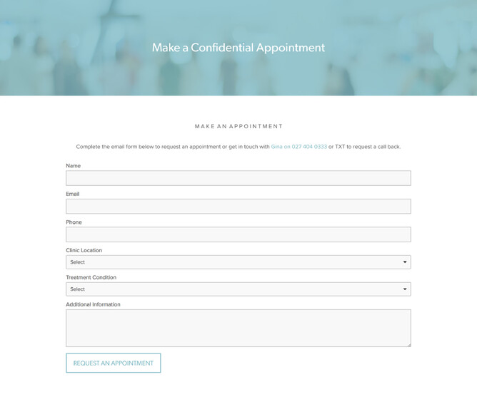 Making appointments is pretty easy with a web form. The website for Gina Madigan Psychologist features a simple form that allows clients to request an appointment. Patients are able to select the clinic location and the treatment condition from a dropdown list making the booking process super easy.