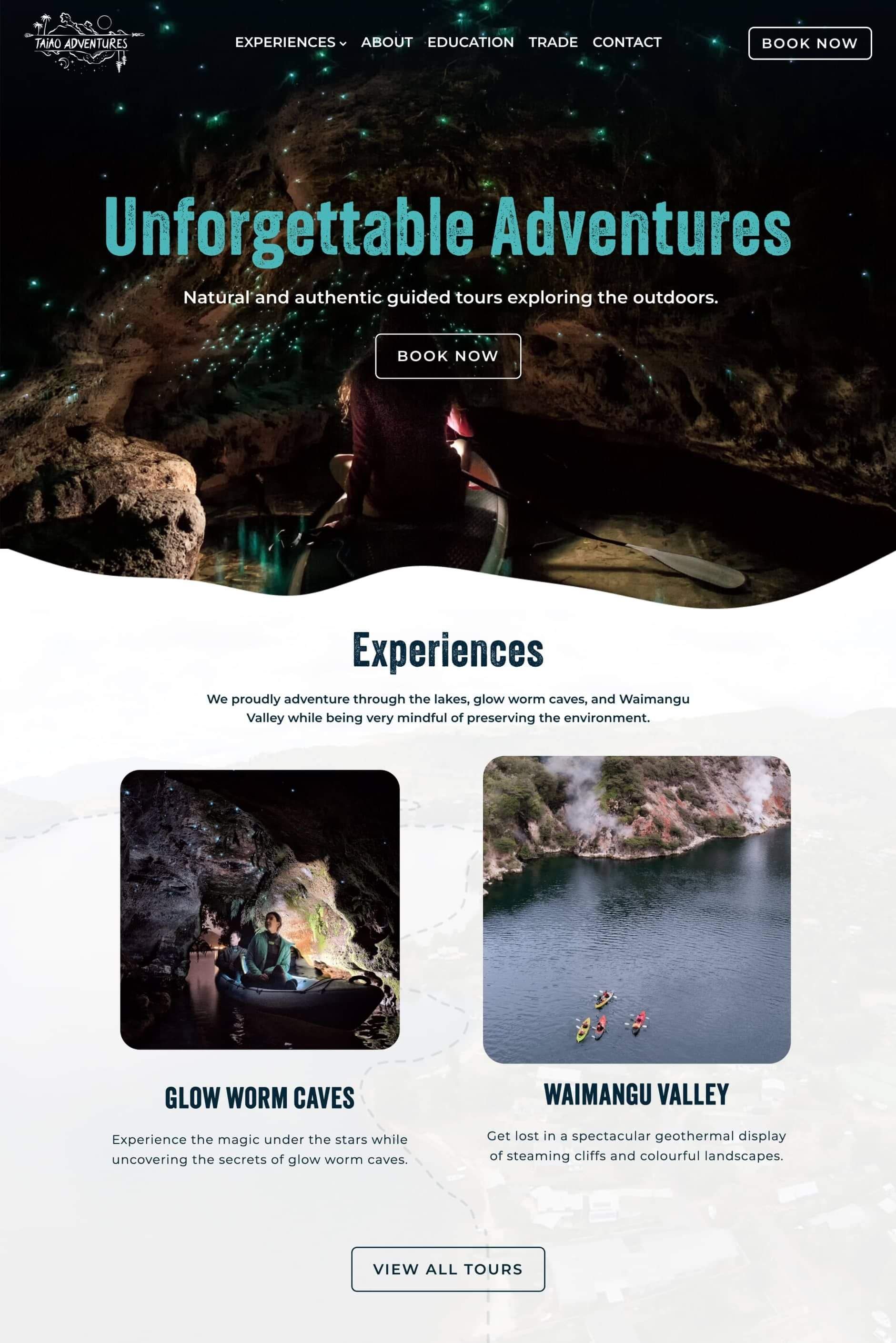 Dimple Digital has beautifully crafted the Taiao Adventures website. The design is both visually stunning and user-friendly, featuring breathtaking imagery of the glow worm caves that instantly draws visitors in. The homepage captures the essence of adventure, with its seamless blend of vibrant visuals, engaging content and the rugged typeface to match.