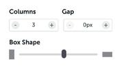ABOVE EXAMPLE: One column full width stack with a text block heading followed by a 3 column Grid Gallery with text titles and a column gap set to reveal the background colour between the images. Left/right internal column spacing is set so the Grid Gallery doesn't go all the way to the edge of the window. Grid Gallery is set to darken pictures on mouseover.