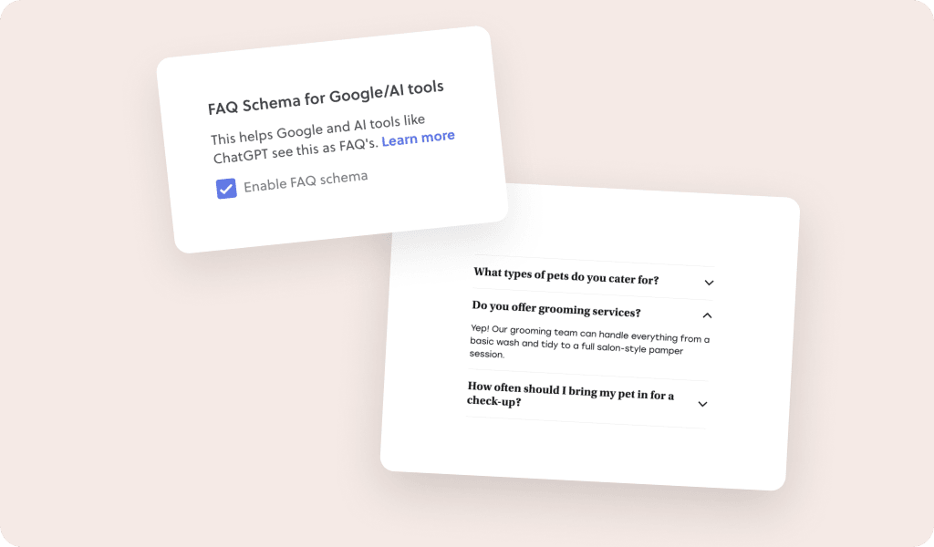 When you use Rocketspark accordion blocks for FAQs, we automatically turn those questions and answers into structured FAQ data that AI and search engines can read.
