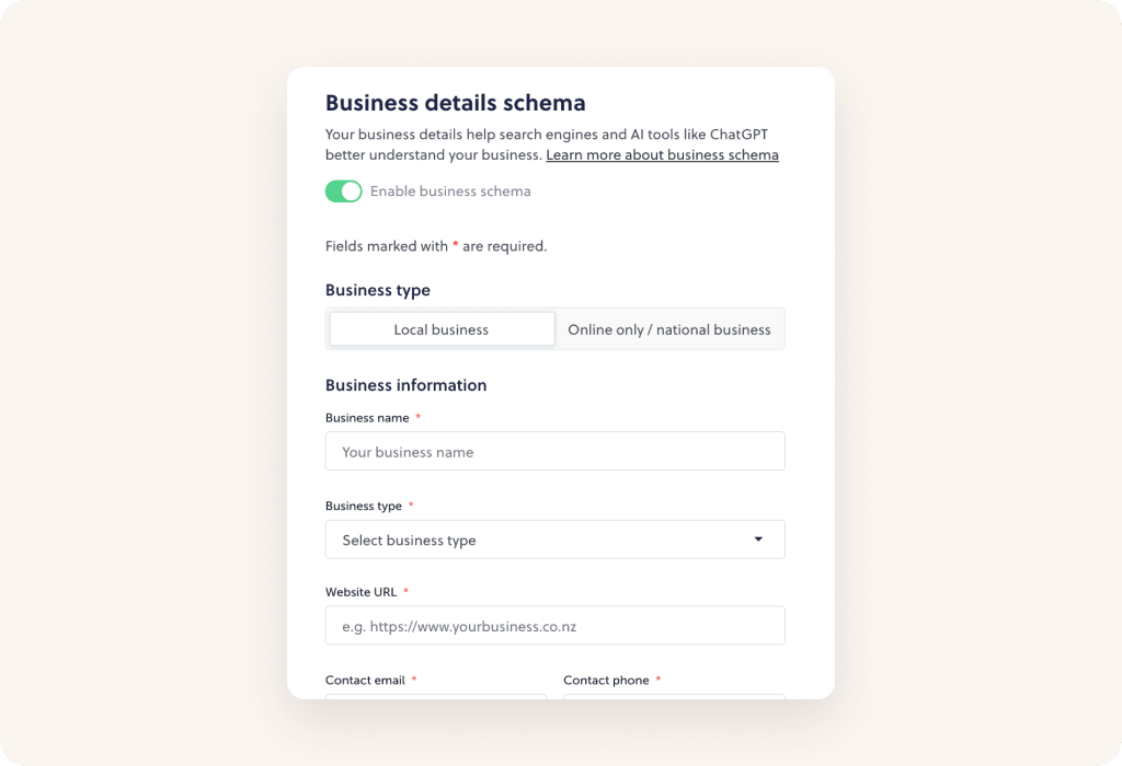 Rocketspark’s business schema turns your basic business details into a single source of truth that is used across your site in a format search engines and AI assistants understand.