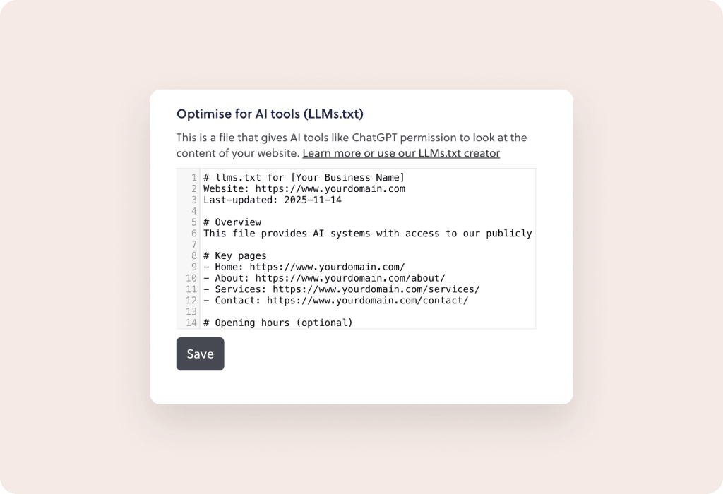 Rocketspark can create and manage this file for you automatically, keeping your site prepared for when AI tools start checking it, without adding any technical jobs to your list.
