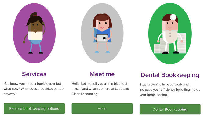 Faces build rapport. Of the bookkeeper websites we looked at 0% had photos of the bookkeeper and less than half listed the bookkeepers name. The result? They don’t feel like there are real people involved in the practice. Users want to see you and your people (stock photos are a no-no!), so don’t hide! Include a photo of yourself or, if you have a team, include a group photo or individual photos of your team. Most bookkeeper practices are a one-two person businesses but photos are still important, because putting a face to the name really helps give you a credibility-boost, no matter what your size. Here are a some examples of bookkeepers who include their photos on their About Us page: