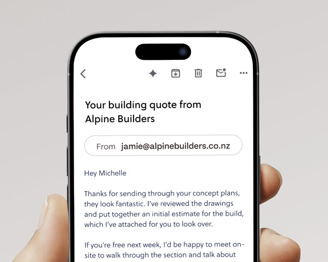 Your email address might seem like a tiny detail, but it can make a big difference to how people see your business. Imagine sending a quote for a job or an invoice as a building company with jamie_buildz48383@hotmail.com on it instead of jamie@alpinebuilders.co.nz. Which one do you think feels more trustworthy?
