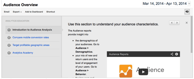 After your whistle-stop clicking tour through Analytics, it might pay to take a more methodical approach. At the top of the page for each section is an “Analytics Education” panel, that helps you go in-depth and get a fuller grasp of what you can discover through Analytics (if it’s not visible, click the mortarboard icon in the top-right corner to view it). Read through the bullet-point lists and watch the videos for the sections that you’re most interested in.