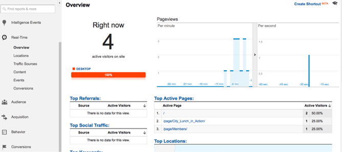 This is where you’ll find what’s happening with your website right now. Real time is more useful for high volume websites where there is potential for large spikes in traffic.  Real time is especially helpful when tracking the impact of your social media activity or if you publish daily content and need to see what’s attracting the most attention.