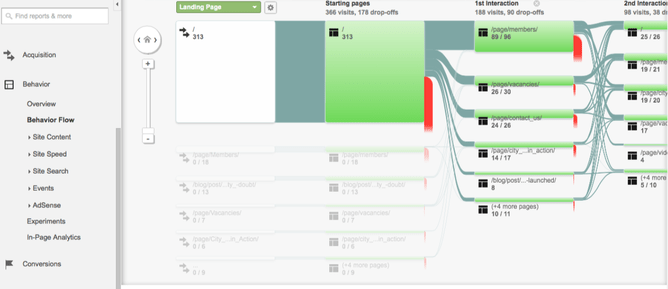 What do you site visitors do when they get to your site? This section has what you need to know about user behaviour, the most important being what pages they are visiting.  The Behaviour Flow option lets you visualise how your visitors progress through your website and where they give up looking, allowing you to identify weak spots.