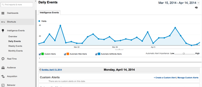 This section is all about alerts. Any time your data suddenly spikes or dips abnormally, Analytics alerts you to the fact. You can then take a look at the data and, with a bit of luck, figure out the reason for the anomaly. Some alerts are already set up for you, but you can also create your own customised alerts.
