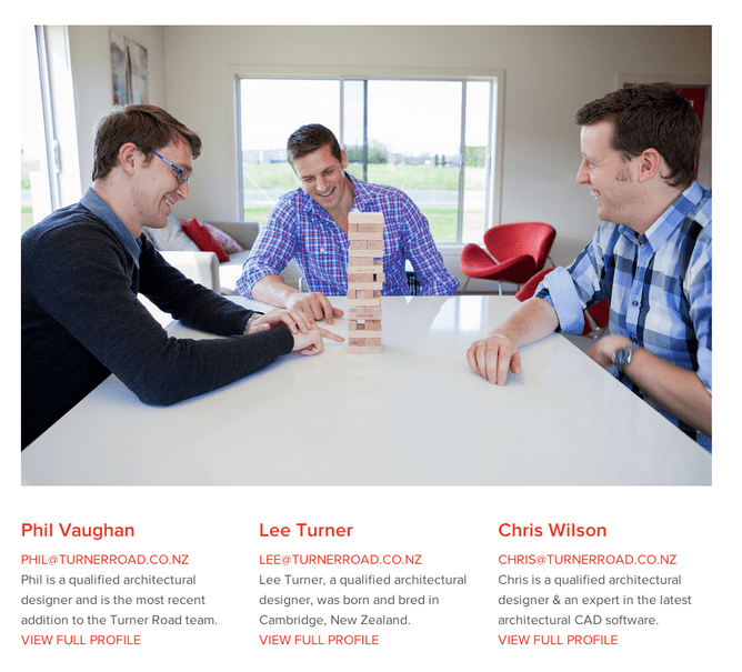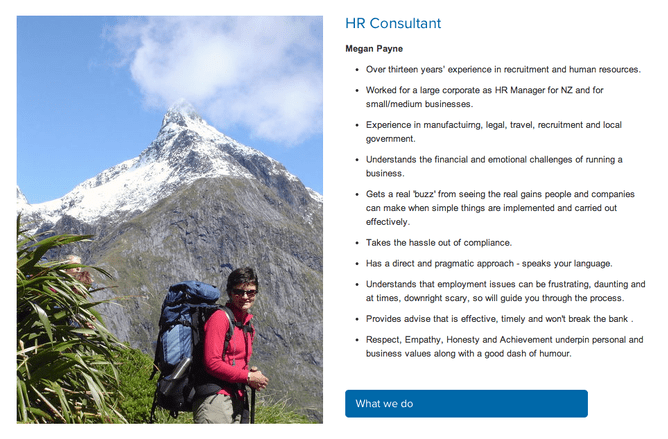 Use either a ⅔, ⅓ stack or a ¾, ¼ stack and put the text in the widest column. By not making the text go the full width of the page it makes the page feel less overwhelming and actually easier on the reader to digest. It’s a good idea to have a decent amount of text on your about us page. You don’t want to overcook it but a single short paragraph will probably reduce trust. If you do have several paragraphs of text on the page, break it up with good headings that explain the text in the paragraph below the heading. People like to scan pages so headings are very important for making sure the information is seen.