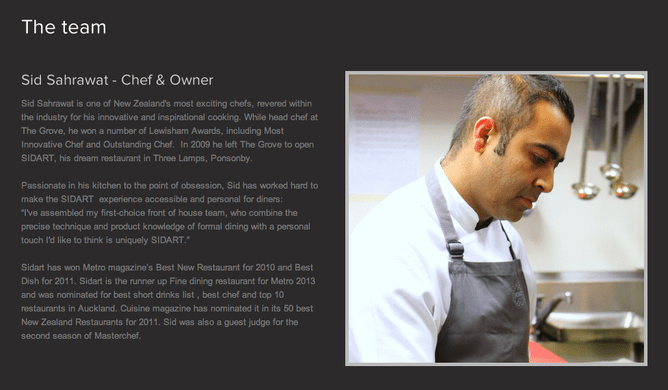 Whether you use a slideshow, a single large image or a small profile pic of yourself, make sure there is something visual on the page near the top of the page. An about us page with nothing visual is a fast way to send people away from your website bored. Make sure the images are of a high quality. Blurry images taken on a phone in bad lighting could have a detrimental effect. Good quality commercial photography isn’t as expensive as you might think.