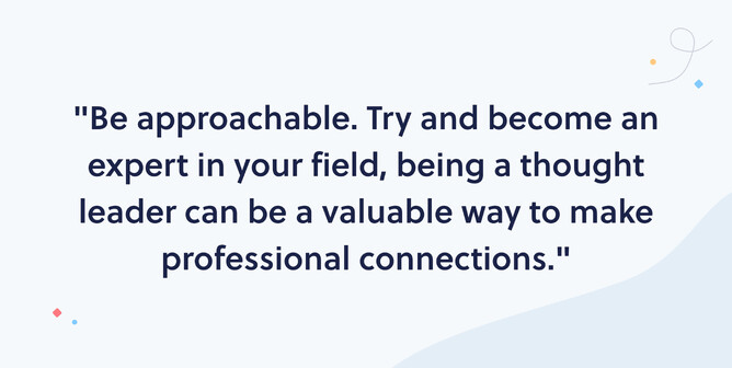 Be approachable. Try and become an expert in your field, being a thought leader can be a valuable way to make professional connections. To do that, you need to create content, blogging, instagram stories, and featuring on things. If you can get on a panel as an expert in your field that’s awesome, it’s great exposure, because you are the expert.