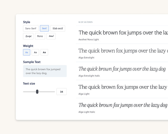 Finding the perfect font is now a breeze with our new font filtering options. Whether you're in search of serif, sans-serif, handwriting styles, bold, light, or something entirely unique – our tools make it easy. You can even use your own text for previews and adjust the size to see exactly how it'll look.