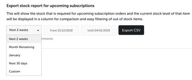 In addition to the runway of upcoming deliveries, you can also export a CSV stock report of stock that is available vs stock that will be required for subscription deliveries within a particular date range.