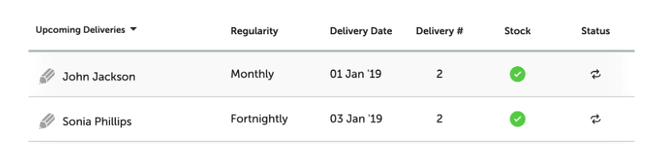 Important: The stock is not ring-fenced for upcoming subscriptions so stock levels could get affected by one-off purchases. This might show multiple deliveries from the same subscription and you can see a delivery number count to see the sequential order of deliveries from the same subscription.