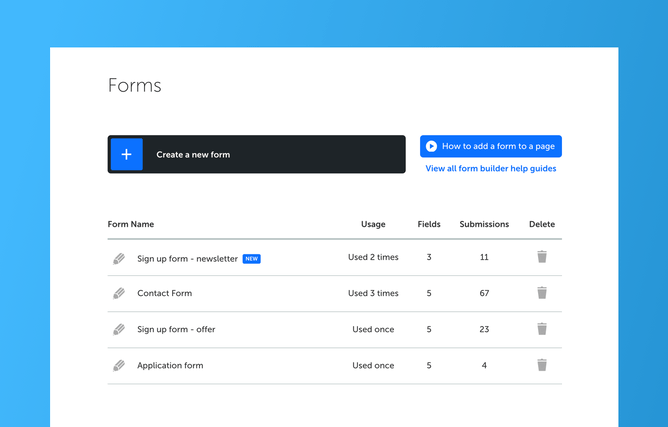 The flexibility of our form builder means you might end up with lots of forms. Thankfully, managing a heap of forms couldn’t be easier. The “My Forms” page, found in your Rocketspark Dashboard, lets you see all your forms at a glance. From here, you can edit your forms, track the number of form submissions made, and delete any you no longer need. And, for forms used multiple times, you no longer need to painstakingly make changes to one form at a time. Just make a change once and it’ll show up across all identical forms used throughout your entire site.