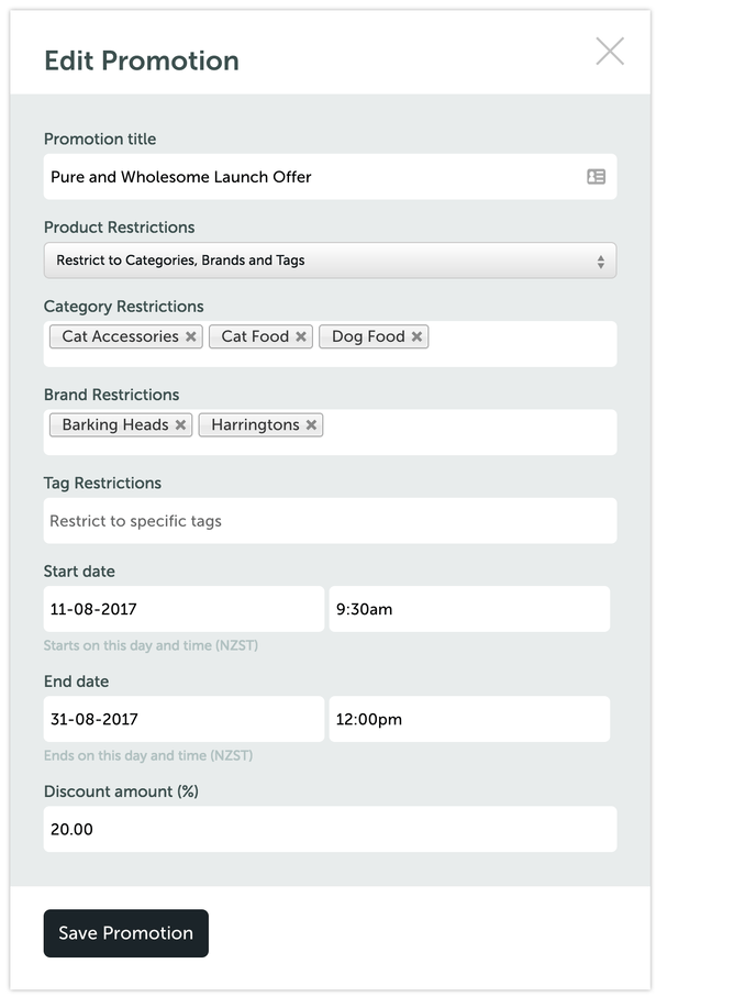 A nice part of our new promotions feature is that you can apply the promotional discount to specific categories, brands and tags or apply the discount sitewide.