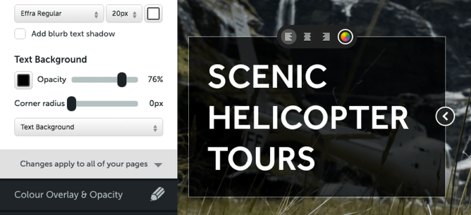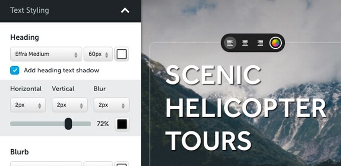 When you add text content over your feature area images, sometimes it can be detrimental to readability. Now it’s possible to add a subtle text shadow effect to feature area heading and blurb text. You can edit the colour, opacity, vertical/horizontal displacement and blur of the text shadow effect.