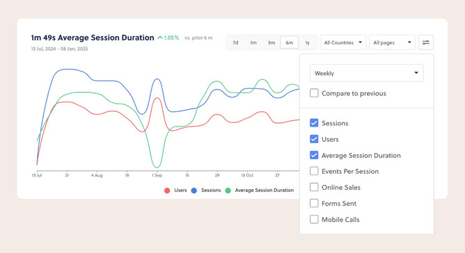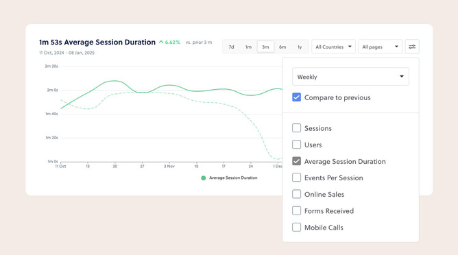 With the Dashboard, you can overlay metrics like sessions, users, average session duration, events per session, mobile calls, sales, and form submissions all on the same graph. Want to see if a bump in visitors led to more calls? Done. Curious if people spend more time on a page after some design changes? Easy.