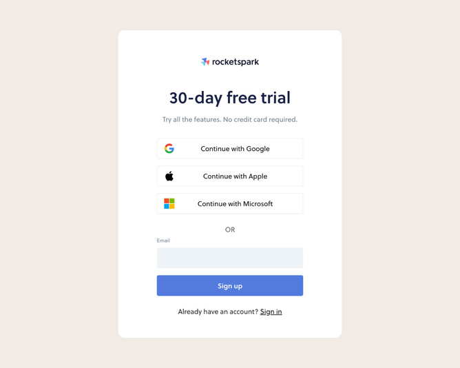 You can now sign up and sign in to Rocketspark with your Google, Apple, or Microsoft account. No new password. No password to remember.
