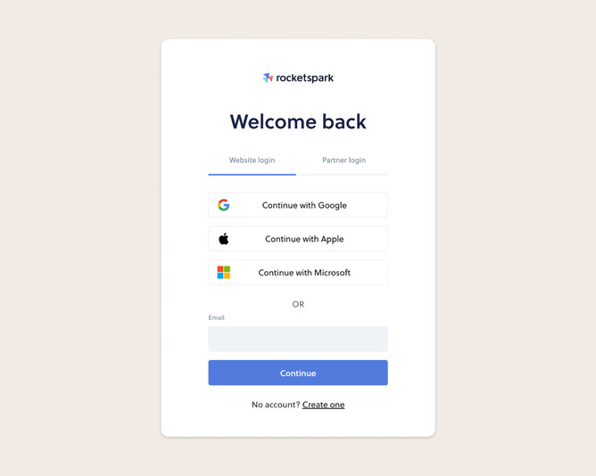 Head to the Rocketspark login page and choose Continue with Google, Apple, or Microsoft.