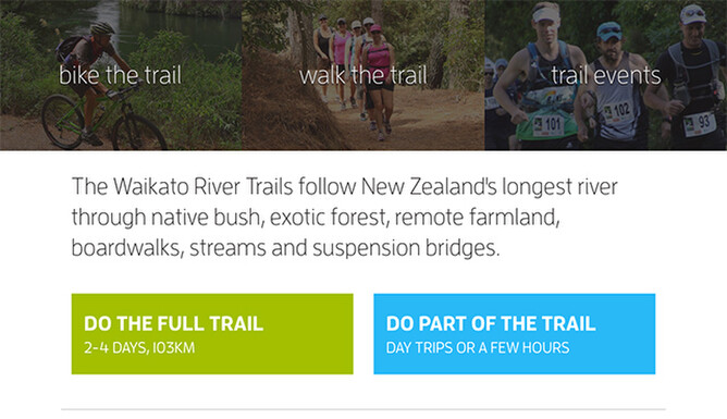 Tourism business success is all about getting visitors to stay longer and do more. The symbiosis between tourism activity operators, accommodation providers and restaurants is a win-win-win relationship. The Waikato River Trails website does this well, promoting bike hire, cafe’s, transport and accommodation at the bottom of most pages in a grid of picture buttons.