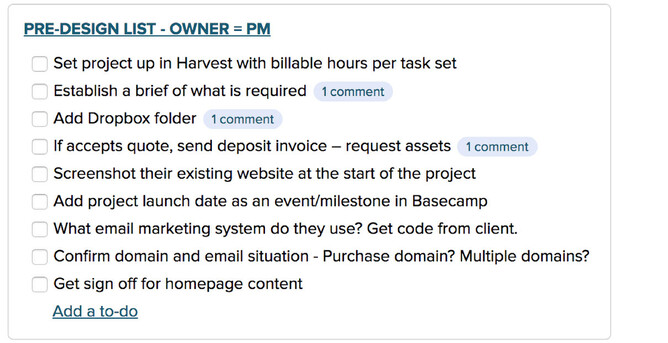 To make Basecamp work really efficiently for us we’ve created a range of templates for projects which includes all the boring but essential elements of a design project such as remembering to invoice the client or doing the browser checking.