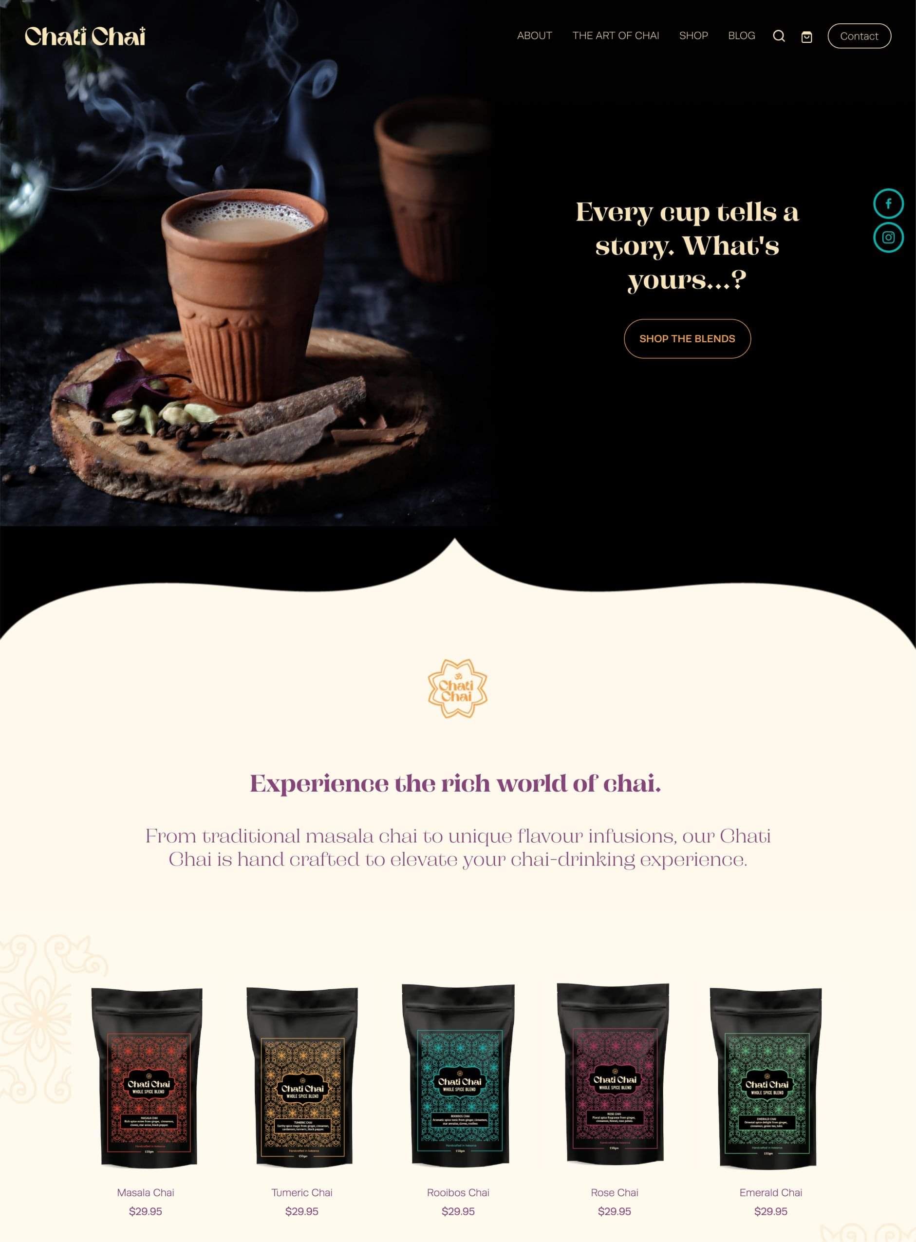 From when the homepage is first loaded, you are greeted with a beautifully staged photo of a chai tea, paired with a typeface to complement the product. The website uses generous spacing throughout and each section is defined through uniquely shaped stack backgrounds and a colour palette that reflects the branding of the product packaging.