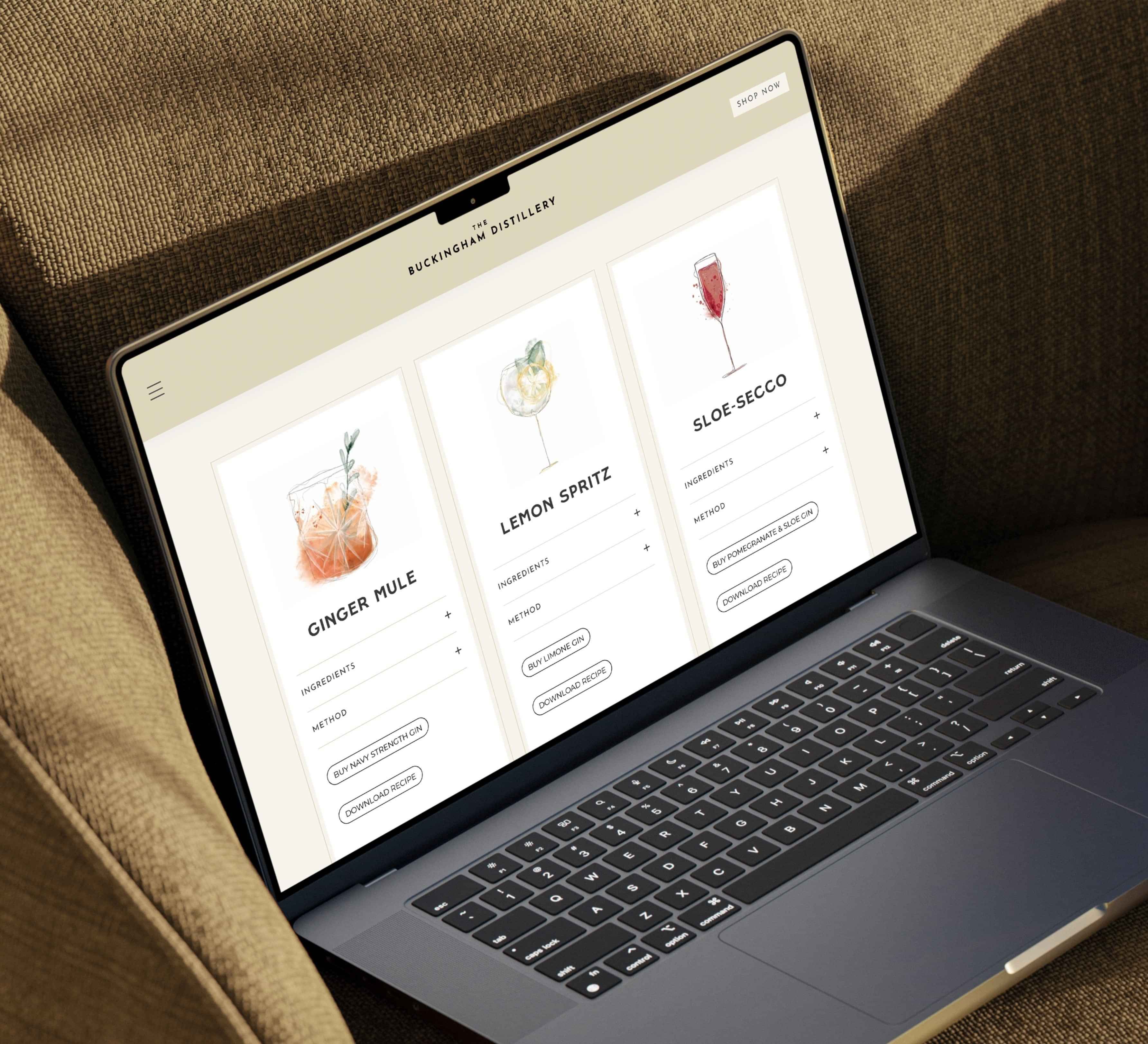 This website is a beautiful example of how strong visual storytelling can bring a brand to life. From the moment you land on the homepage, the stunning custom photography sets the tone, capturing the clarity, craftsmanship and premium quality of Buckingham Distillery’s products with precision. Every image feels intentional and polished, allowing the gin to shine in a way that feels both luxurious and approachable.