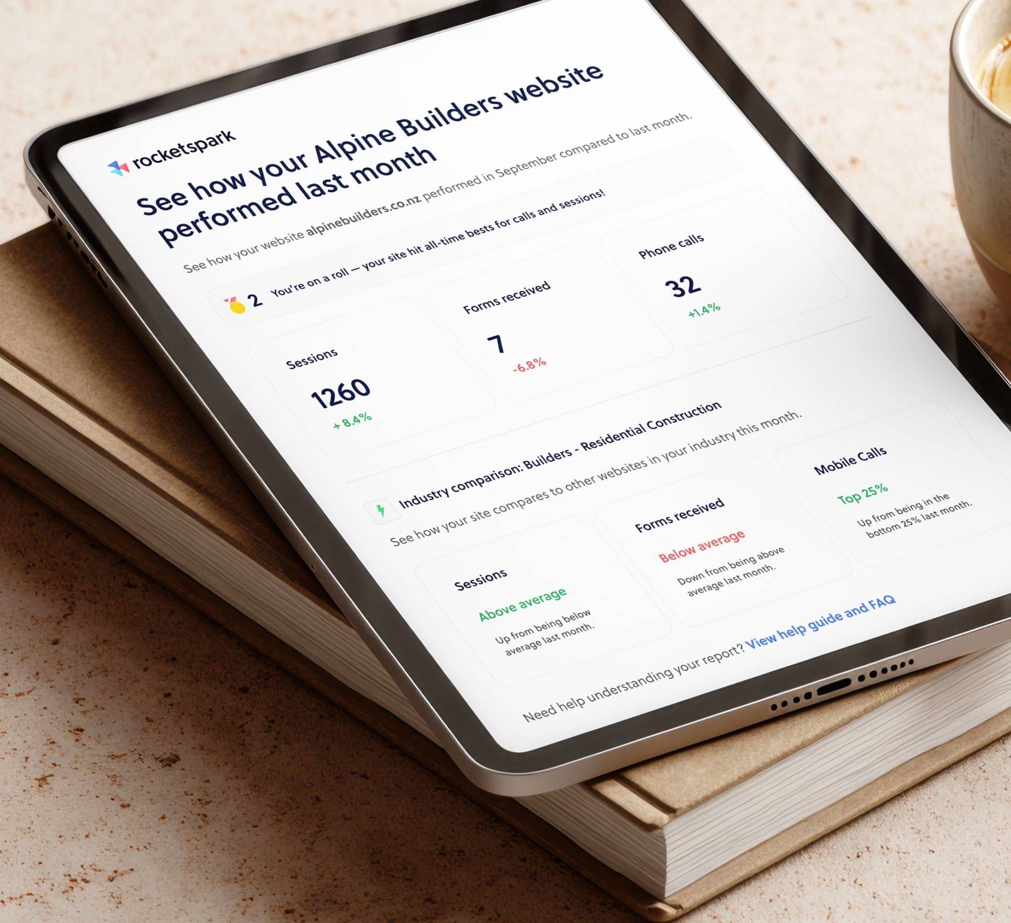 Every month, your visitors, leads, calls, and sales are compared against other Rocketspark businesses in the same industry. You'll see exactly which bracket you're in — and what it means.