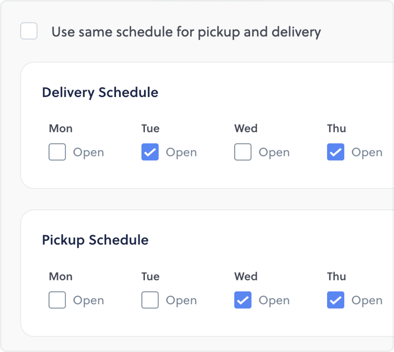 Only offer pickups on the weekends or delivery on certain days of the week? Run on a different schedule for pickup and delivery.