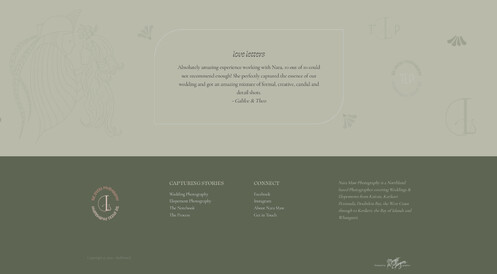 The design style of this website is minimalistic and elegant, allowing Nara's photography to be the focal point. The use of a muted colour palette gives the website a timeless and sophisticated feel, which is perfect for the wedding photography industry.